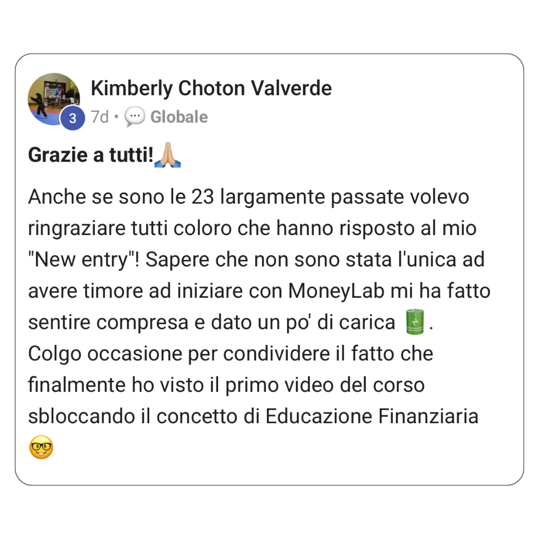 Marzia era scettica all’inizio, ma qualcosa le ha detto di fidarsi. Oggi, con entusiasmo, racconta di come MoneyLab sia diventata una scoperta concreta che ha già iniziato a fare la differenza nella sua vita. Un percorso che la sta aiutando passo dopo passo… tanto che non vede l’ora di coinvolgere anche i suoi colleghi!