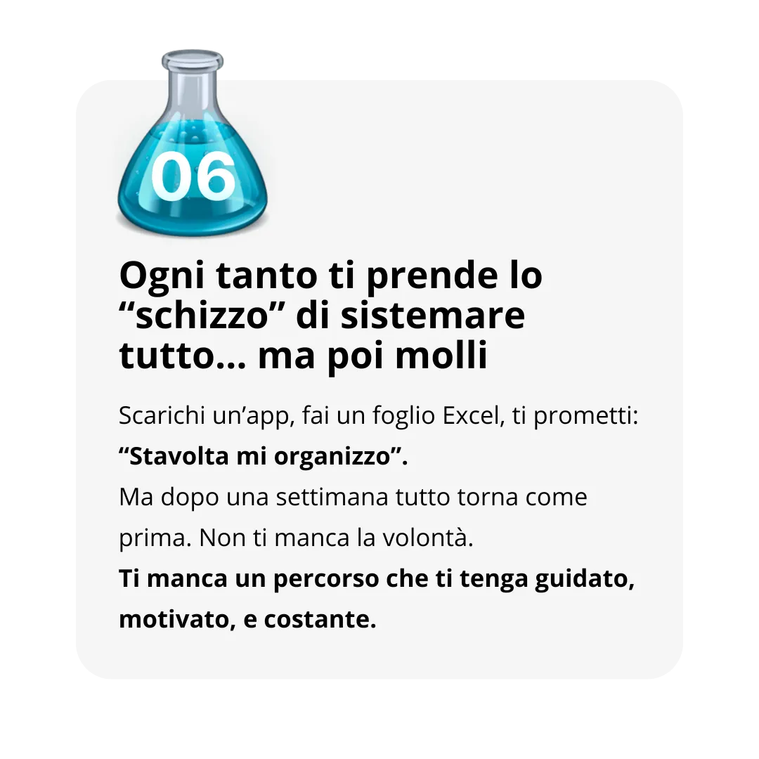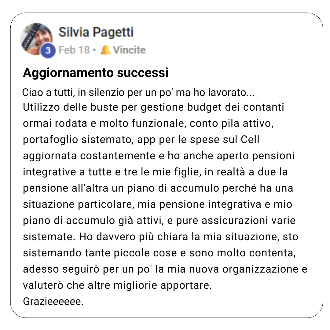 Maria Rosa partiva senza un vero metodo: nessun fondo, nessun tracciamento, solo confusione. Con MoneyLab ha ritrovato il controllo, capito i suoi errori e iniziato a costruire un rapporto più sereno con il denaro.
